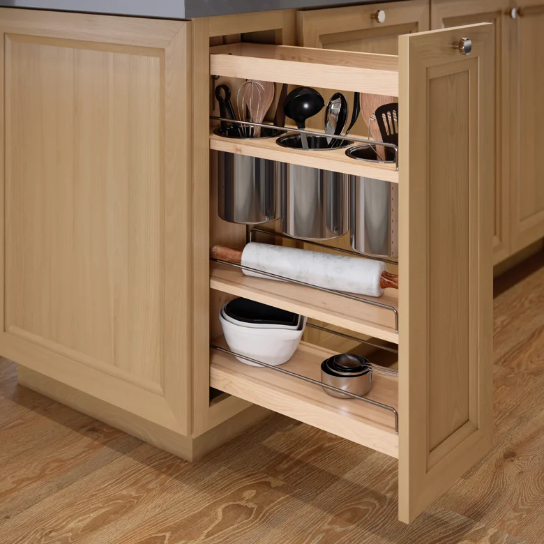 From utensils to baking sheets, drawer dividers keep everything in its place. Vertical tray dividers can be added to base cabinets for cutting boards and cookie sheets, while spice drawer inserts store seasonings flat so you can see labels at a glance. These small touches make everyday cooking faster and easier.